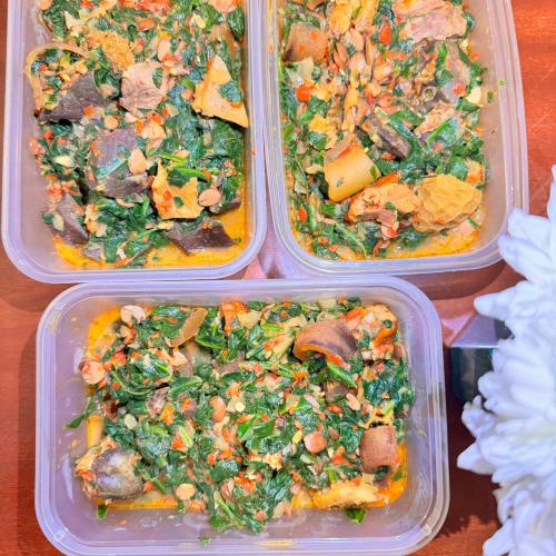 Eforiro is a delicious and flavorful Nigerian spinach stew, made with tender meats like goat meat, beef, or chicken, and seasoned with aromatic spices, locust beans (iru), and rich palm oil. The stew is often enjoyed with rice, fufu, or pounded yam, offering a hearty and satisfying meal that's a true representation of Nigerian cuisine.